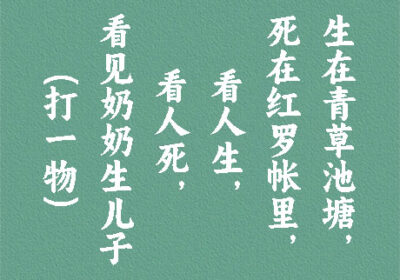 谜面:生在青草池塘,死在红罗帐里,看人生,看人死,看见奶奶生儿子。 (打一物) 谜底:席子 段子乐解释:从石器时代起,“席子”就已经成为人们常用的生活器具之一。