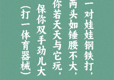 谜面:一对娃娃钢铁打,两头如锤腰不大,你若天天与它玩,保你双手劲儿大。 (打一体育器械) 谜底:哑铃 段子乐解释:哑铃是一种用于增强肌肉力量训练的简单器材。它的主要材料是铸铁,有的…