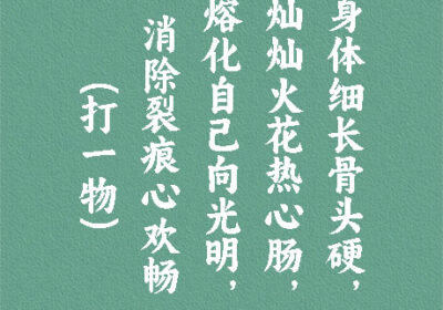 谜面:身体细长骨头硬,灿灿火花热心肠,熔化自己向光明,消除裂痕心欢畅。 (打一物) 谜底:焊条 段子乐解释:焊条(coveredelectrode),是在金属焊芯外将涂料(药皮)均…