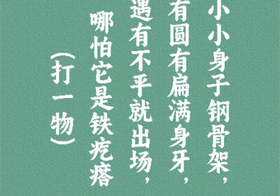 谜面:小小身子钢骨架,有圆有扁满身牙,遇有不平就出场,哪怕它是铁疙瘩。 (打一物) 谜底:锉刀 段子乐解释:锉刀表面上有许多细密刀齿、条形,用于锉光工件的手工工具。用于对金属、木料…