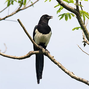 谜面:一物生来好模样,长长尾巴短身材,黑衣黑袍白肚皮,红红嘴巴圆眼睛,枝头一站叫喳喳,专向人间报喜来。 (打一动物)