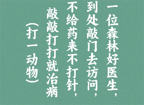 谜面:一位森林好医生,到处敲门去访问,不给药来不打针,敲敲打打就治病。 (打一动物)