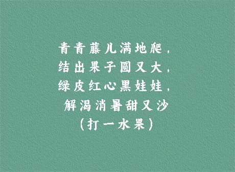 谜面:青青藤儿满地爬,结出果子圆又大,绿皮红心黑娃娃,解渴消暑甜又沙。 (打一水果)
