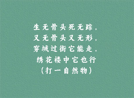 谜面:生无骨头死无踪,又无骨头又无形,穿城过街它能走,绣花楼中它也行。 (打一自然物)