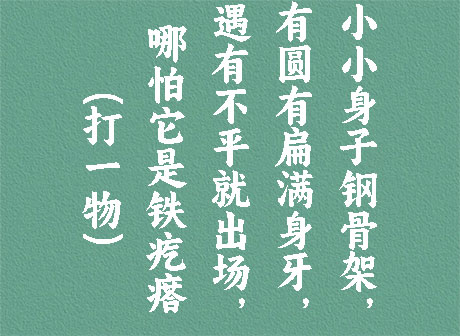 谜面:小小身子钢骨架,有圆有扁满身牙,遇有不平就出场,哪怕它是铁疙瘩。 (打一物) 谜底:锉刀 段子乐解释:锉刀表面上有许多细密刀齿、条形,用于锉光工件的手工工具。用于对金属、木料、皮革等表层做微量加工。